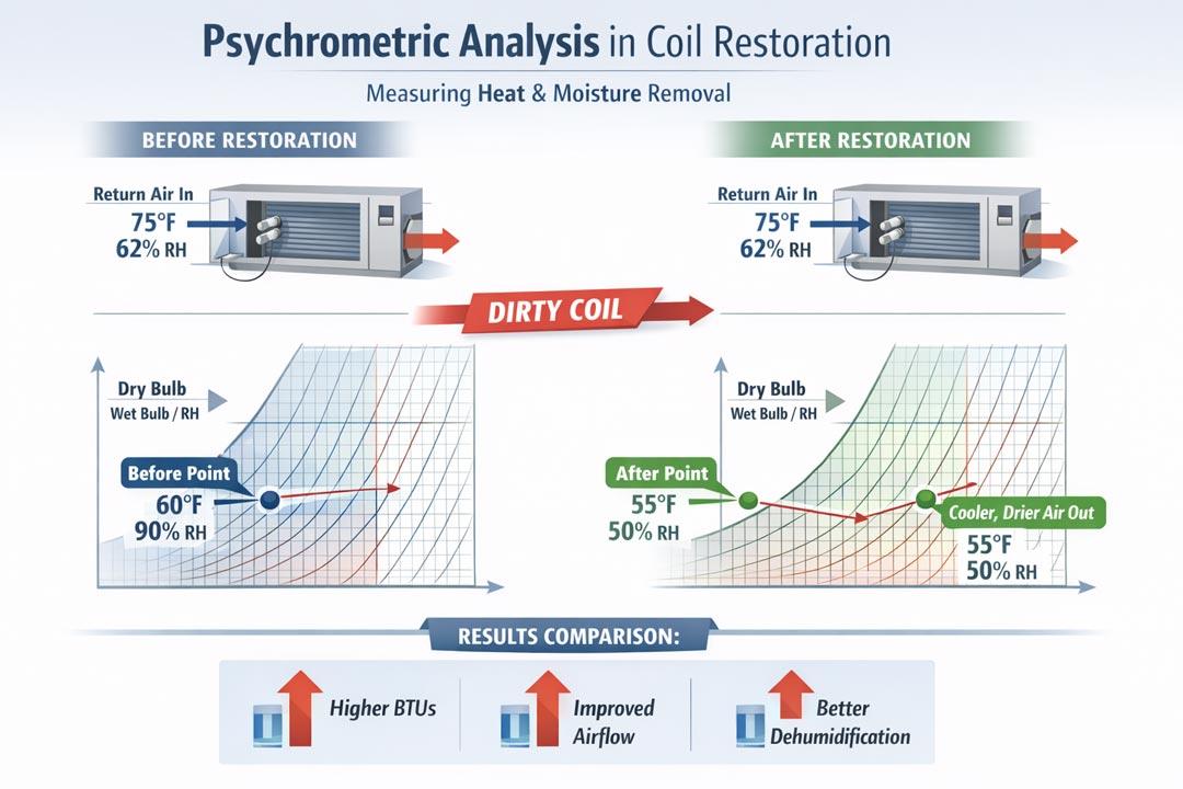 Using psychrometric analysis, we measure the exact energy your system removes from the air—before and after restoration. That means real, data-backed proof of performance improvements, not guesswork. All the RTUs were cleaned using the Biomik Process.